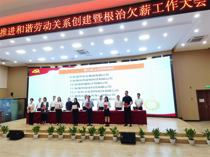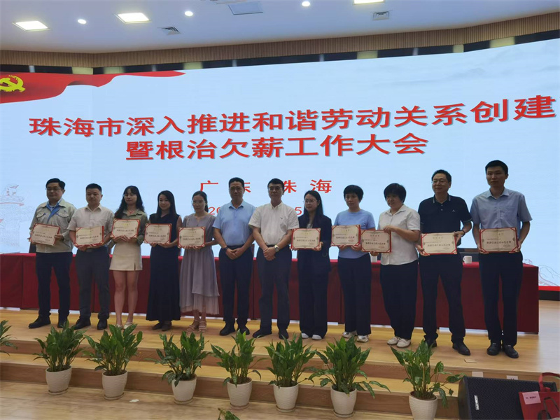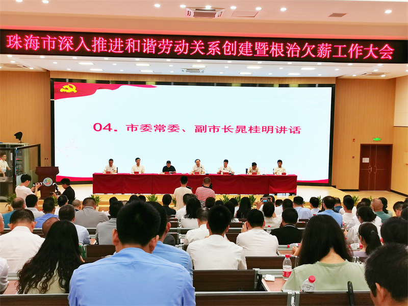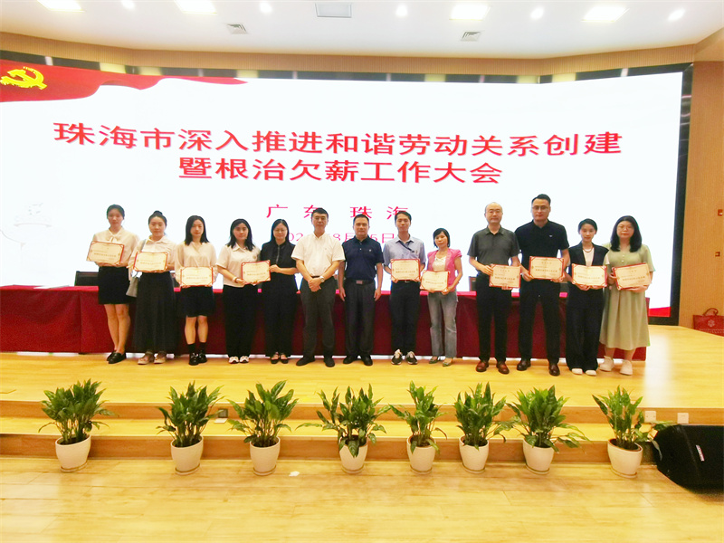 8月15日上午,珠海召开深入推进和谐劳动关系创建暨根治欠薪工作会议。会议深入学习贯彻党的二十届三中全会精神和习近平总书记关于构建和谐劳动关系的重要指示批示精神,认真落实省、市相关工作部署,全面总结2023年以来全市和谐劳动关系创建和根治欠薪工作,交流工作经验,部署下阶段重点任务,为受市级以上表彰的和谐劳动关系创建和根治欠薪工作先进单位(个人)及企业代表颁奖。市委常委、副市长晁桂明出席并讲话。会议由市人力资源社会保障局局长潘伟明主持。