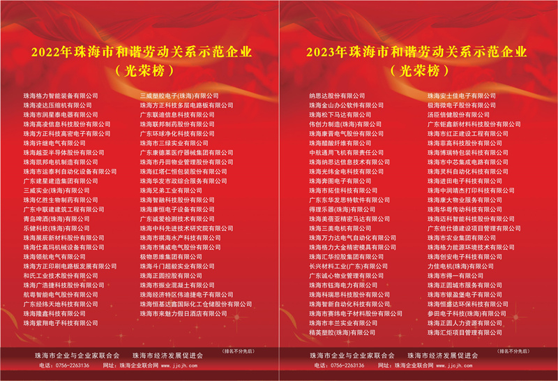 市协调劳动关系三方四家单位负责同志市人社局副局长曾德能、市总工会副主席梁斌、市工商联副主席张光暖、市企联会执行会长庄大泉与荣获2023珠海市和谐劳动关系示范企业负责人及代表合影。
