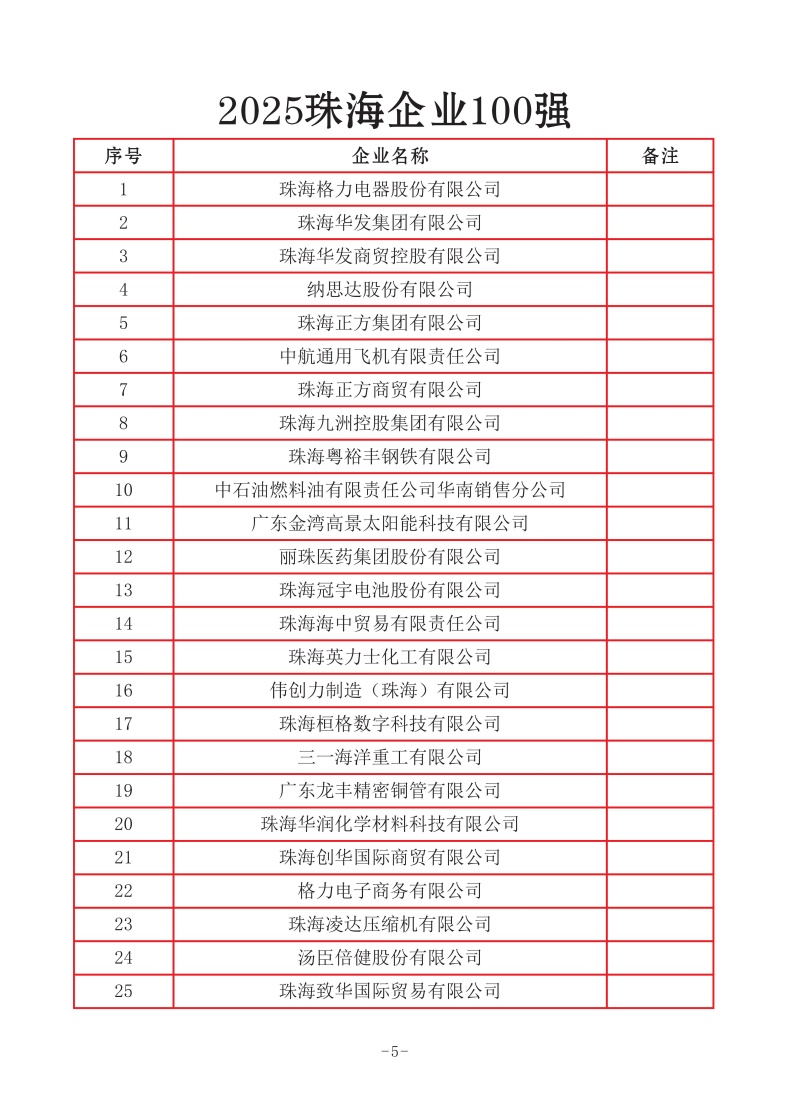 近日,香山智库企业家大讲堂(99期)--2025年珠海企业100强发展报告发布,华商企业联合网、香山智库企业家论坛组委会联合发布《2025年珠海企业100强发展报告》,报告显示:2025年珠海市100强入围企业主营业务收入均超过10亿,其中格力电器和华发集团主营业务收入连续5年超过1000亿元,再度同登中国企业500强榜单。格力电器以1900.4亿元的营业收入位列第148位。作为空调领域的领头羊,格力电器在传统空调业务保持领先优势的同时,还在冰洗生活电器领域迈上新征程,展现其多元化的战略布局与强大的市场竞争力。华发集团以1521.2亿元营收,位列第285位;新上榜的,还有打印设备和耗材龙头企业纳思达股份有限公司,位列第496名。在2025广东企业500强榜单中,珠海企业上榜13家,排名第五,同比增加2家。