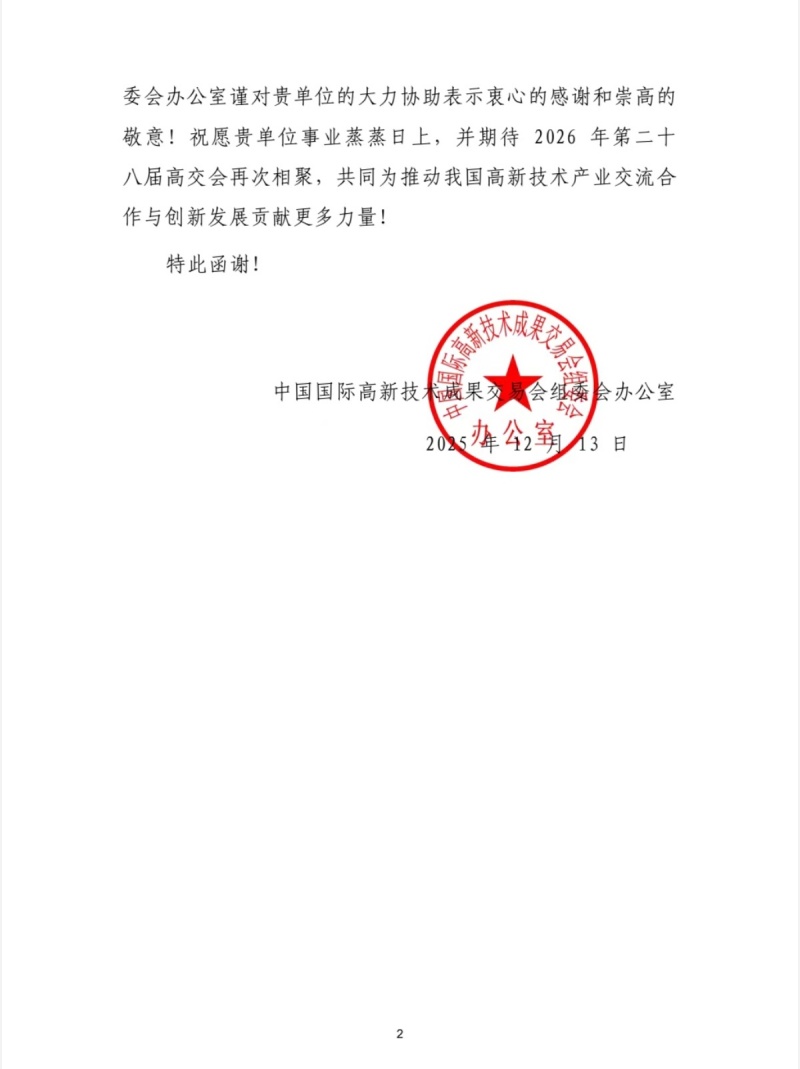 近日,我会收到来自深圳市人民政府主办的第27届中国国际高新技术成果交易会组委会办公室的感谢信,对我会在本届高交会专业观众组织工作中的周密部署与鼎力支持和其他相关工作大力协助表示衷心的感谢和崇高的敬意,并期待2026年第28届高交会再次相聚,共同为推动我国高新技术产业交流合作与创新发展贡献更多力量。