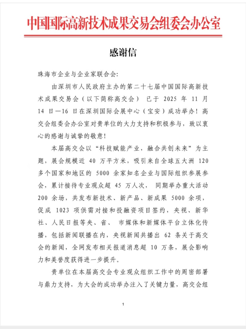 近日,我会收到来自深圳市人民政府主办的第27届中国国际高新技术成果交易会组委会办公室的感谢信,对我会在本届高交会专业观众组织工作中的周密部署与鼎力支持和其他相关工作大力协助表示衷心的感谢和崇高的敬意,并期待2026年第28届高交会再次相聚,共同为推动我国高新技术产业交流合作与创新发展贡献更多力量。